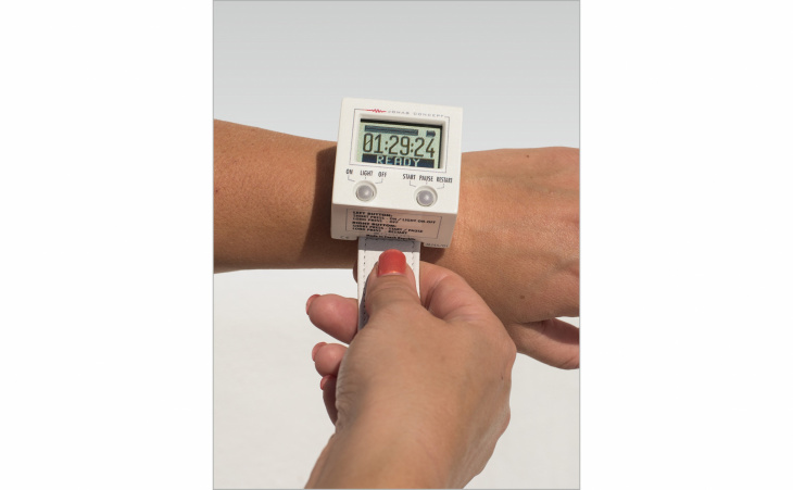 - Aby włączyć urządzenie naciśnij krótko lewy przycisk (ON). Wyświetlacz pokazuje czas, w prawym górnym rogu stan baterii a na dolnym pasku napis READY, tzn. urządzenie jest gotowe do użycia. Jeśli chcesz, aby wyświetlacz się zaświecił, naciśnij krótko lewy przycisk (LIGHT), jeśli chcesz wyłączyć wyświetlacz, ponownie naciśnij krótko lewy przycisk (LIGHT).
